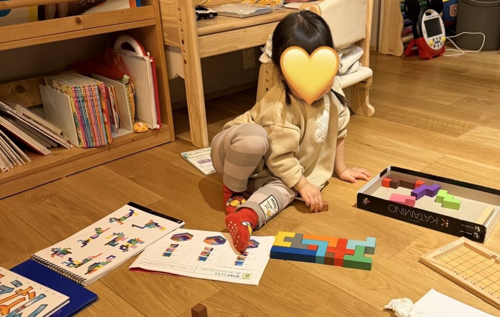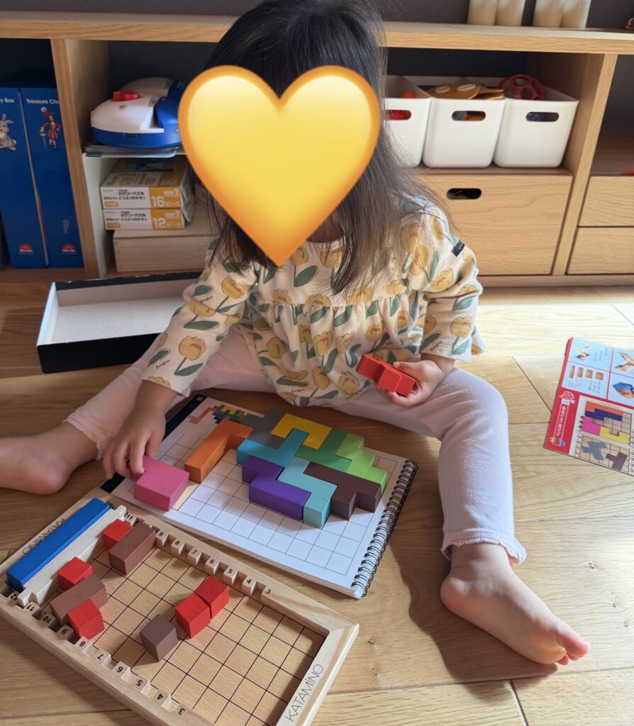 パズルというと平面のイメージがありますが、カタミノは「この形をどう組み合わせるか」を考えるので、平面だけでなく、立体で考える力も使うおもちゃだなと感じています。